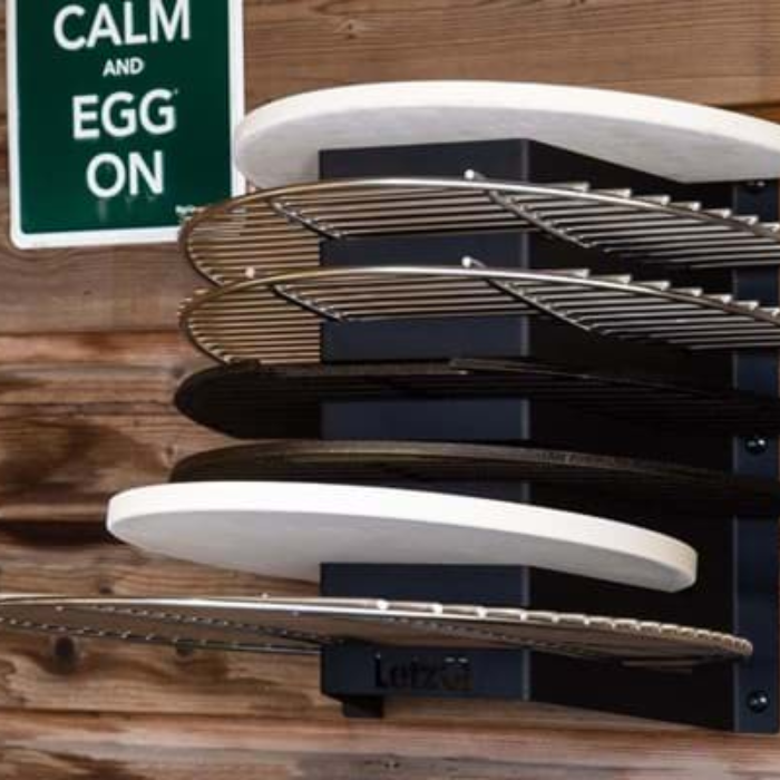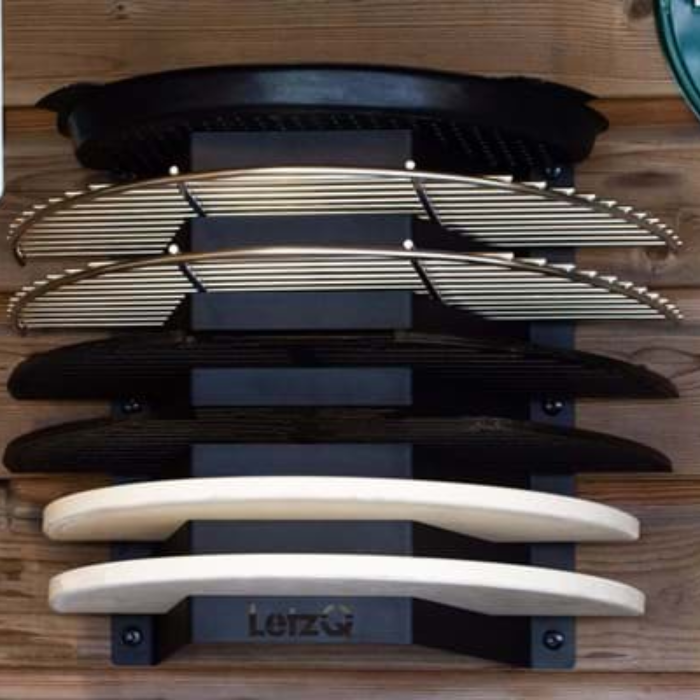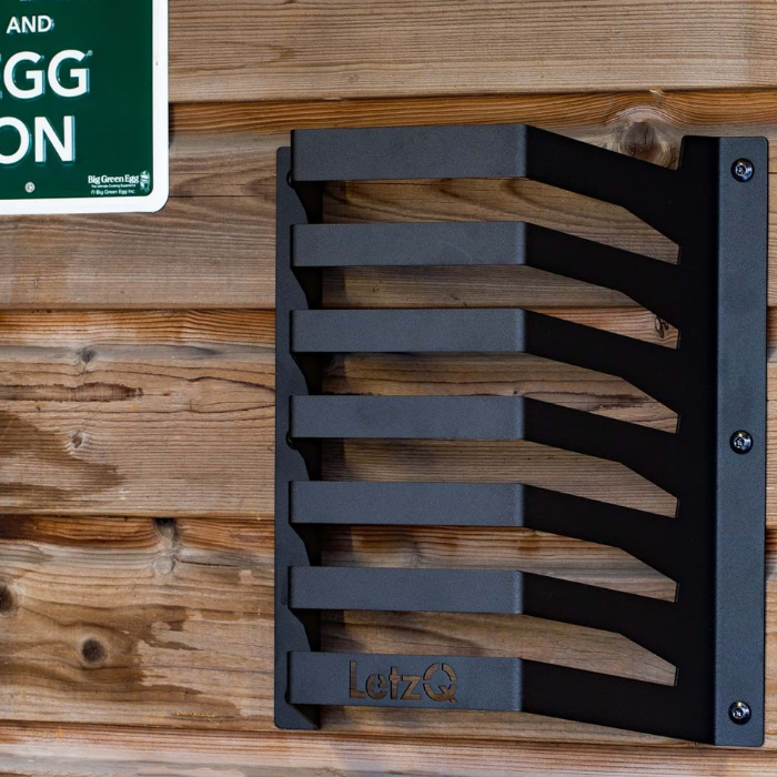 De LetzQ accessoirehouder/opbergrek biedt ruimte voor hele of halve roosters, bakplaten en halve ConvEGGtor stenen. Het opbergrek kan aan de muur worden bevestigd en heeft hiervoor 6 voorgeboorde gaten van het formaat M6. Belangrijk om op te merken is dat schroeven of bouten niet zijn meegeleverd en apart moeten worden aangeschaft. Het LetzQ opbergrek is gemaakt van roestvrijstaal en is zwart gepoedercoat. Je kunt in totaal 7 accessoires er in plaatsen. De uitsparingen zijn geschikt voor accessoires met een maximale dikte van 25 mm.