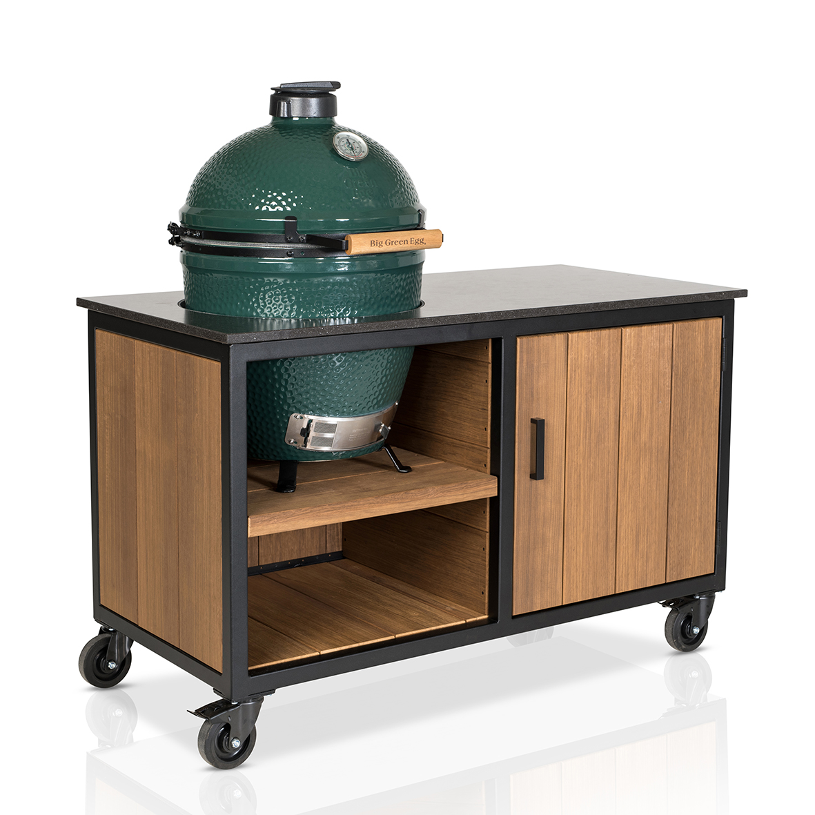 Combinatiedeal voor de Big Green Egg Large + Fraaii Tafel Staal Fraké Storage. Het frame van de Fraaii Tafel Staal Fraké Storage is gemaakt van zwart gepoedercoat staal en uitermate geschikt om gedurende alle seizoenen buiten te gebruiken. De houten inleg is gemaakt van Fraké hout. Op het Dekton werkblad heb je voldoende ruimte om gerechten te bereiden of bbq accessoires neer te leggen. De tafel biedt voldoende opbergruimte en de 4 zwenkwielen zorgen ervoor dat je de hem gemakkelijk kunt verrijden naar iedere gewenste plek in de tuin. De tafel is standaard uitgevoerd met mat zwarte handgrepen. Het Dekton werkblad geeft het meubel een luxe uitstraling en is gemakkelijk te reinigen.