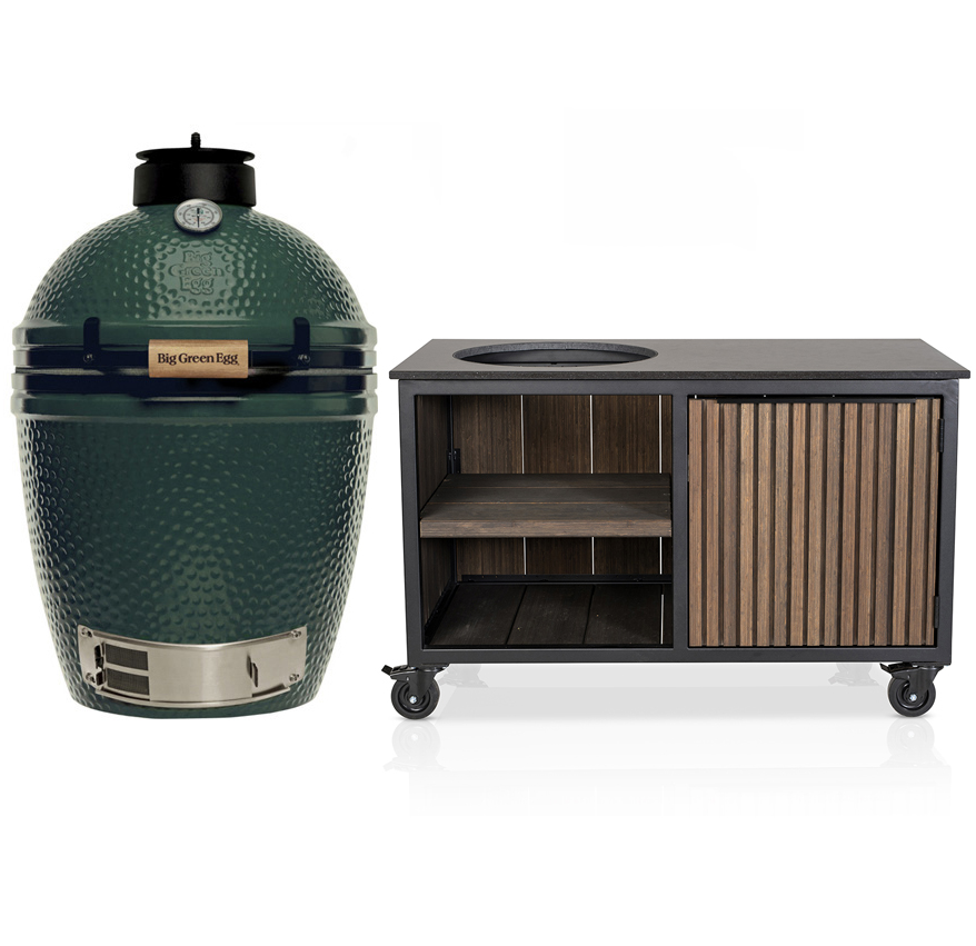 Combinatiedeal voor de Big Green Egg Medium + Fraaii Tafel Bamboo Graphite Rhombus Storage. Het frame van de Fraaii Tafel Bamboo Graphite Rhombus Storage is gemaakt van zwart gepoedercoat staal en uitermate geschikt om gedurende alle seizoenen buiten te gebruiken. De houten inleg is gemaakt van bamboe hout. Op het Dekton werkblad heb je voldoende ruimte om gerechten te bereiden of bbq accessoires neer te leggen. De tafel biedt voldoende opbergruimte en de 4 zwenkwielen zorgen ervoor dat je de hem gemakkelijk kunt verrijden naar iedere gewenste plek in de tuin. De tafel is standaard uitgevoerd met mat zwarte handgrepen.