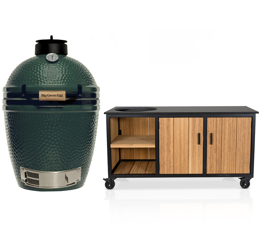 Combinatiedeal voor de Big Green Egg Medium + Fraaii Tafel Bamboo Natural Inferno. Het frame van de Fraaii Tafel Bamboo Natural Inferno is gemaakt van zwart gepoedercoat staal en uitermate geschikt om gedurende alle seizoenen buiten te gebruiken. De houten inleg is gemaakt van bamboe hout. Op het Dekton werkblad heb je voldoende ruimte om gerechten te bereiden of bbq accessoires neer te leggen. De tafel biedt voldoende opbergruimte en de 4 zwenkwielen zorgen ervoor dat je de hem gemakkelijk kunt verrijden naar iedere gewenste plek in de tuin. De tafel is standaard uitgevoerd met mat zwarte handgrepen.