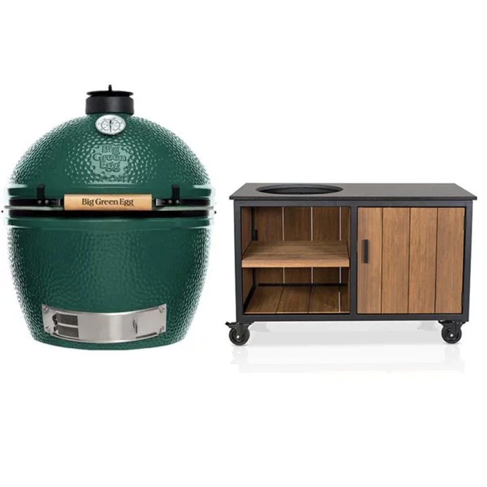 Combinatiedeal voor de Big Green Egg XL + Fraaii Tafel Staal Fraké Storage. Het frame van de Fraaii Tafel Staal Fraké Storage is gemaakt van zwart gepoedercoat staal en uitermate geschikt om gedurende alle seizoenen buiten te gebruiken. De houten inleg is gemaakt van Fraké hout. Op het Dekton werkblad heb je voldoende ruimte om gerechten te bereiden of bbq accessoires neer te leggen. De tafel biedt voldoende opbergruimte en de 4 zwenkwielen zorgen ervoor dat je de hem gemakkelijk kunt verrijden naar iedere gewenste plek in de tuin. De tafel is standaard uitgevoerd met mat zwarte handgrepen. Het Dekton werkblad geeft het meubel een luxe uitstraling en is gemakkelijk te reinigen.