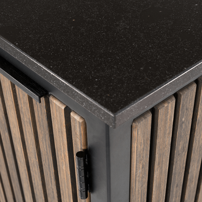 Het frame van de Fraaii Tafel Bamboo Graphite Rhombus Inferno is gemaakt van zwart gepoedercoat staal en uitermate geschikt om gedurende alle seizoenen buiten te gebruiken. De houten inleg is gemaakt van bamboe hout met rhombus afwerking. Op het Dekton werkblad heb je voldoende ruimte om gerechten te bereiden of bbq accessoires neer te leggen. De tafel biedt voldoende opbergruimte en de 4 zwenkwielen zorgen ervoor dat je de hem gemakkelijk kunt verrijden naar iedere gewenste plek in de tuin. De tafel is standaard uitgevoerd met mat zwarte handgrepen.