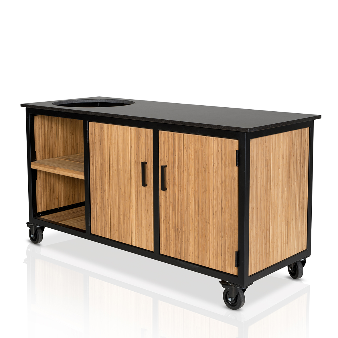Het frame van de Fraaii Tafel Bamboo Natural Inferno is gemaakt van zwart gepoedercoat staal en uitermate geschikt om gedurende alle seizoenen buiten te gebruiken. De houten inleg is gemaakt van bamboe hout. Op het Dekton werkblad heb je voldoende ruimte om gerechten te bereiden of bbq accessoires neer te leggen. De tafel biedt voldoende opbergruimte en de 4 zwenkwielen zorgen ervoor dat je de hem gemakkelijk kunt verrijden naar iedere gewenste plek in de tuin. De tafel is standaard uitgevoerd met mat zwarte handgrepen.
