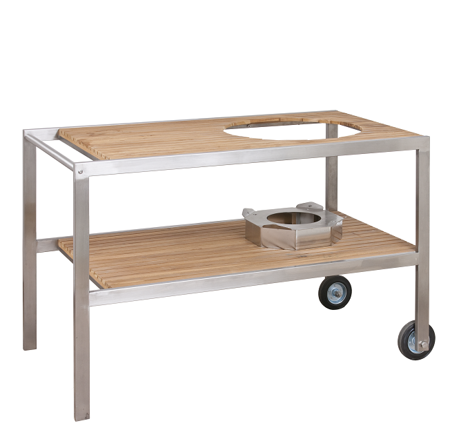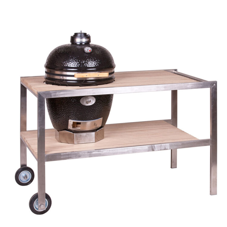 Maak je Monolith buitenkeuken compleet met deze Trolley voor de Monolith Icon en Junior en plaats je BBQ waar jij maar wilt. De Monolith ICON / Junior trolley is gemaakt van zwart gepoedercoat staal en wordt geleverd met robuuste wielen waarvan er 2 geremd zijn. Aan weerszijde van de trolley bevinden zich uitklapbare tafeltjes van hetzelfde Acacia hout als de middenstuk. Het middenstuk bestaat uit een plateau waarop de Icon of Junior geplaatst kan worden met daaronder een opbergruimte. Het plateau is in hoogte verstelbaar, zodat je altijd op de juiste hoogte kunt werken aan je Icon of Junior. Aan de achterkant bevind zich standaard een ophanghaak om de bakplaat aan op te hangen. Waardoor je deze altijd in de buurt hebt, wanneer je hem nodig hebt.