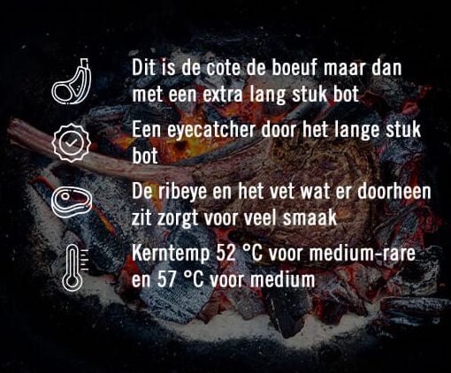 De Tomahawk Steak is een rib eye met een indrukwekkend stuk been. Dit prachtige stuk vlees is een echte BBQ-klassieker, bekend om zijn mooie marmering en volle rib eye smaak. De Tomahawk heeft een grote hoeveelheid intramusculair vet, wat zorgt voor een smaakvolle en malse steak. Met een dikte van ongeveer 3 centimeter en een bot dat ongeveer 300 gram weegt, kun je met gemak met twee tot vier personen van deze lekkernij genieten.