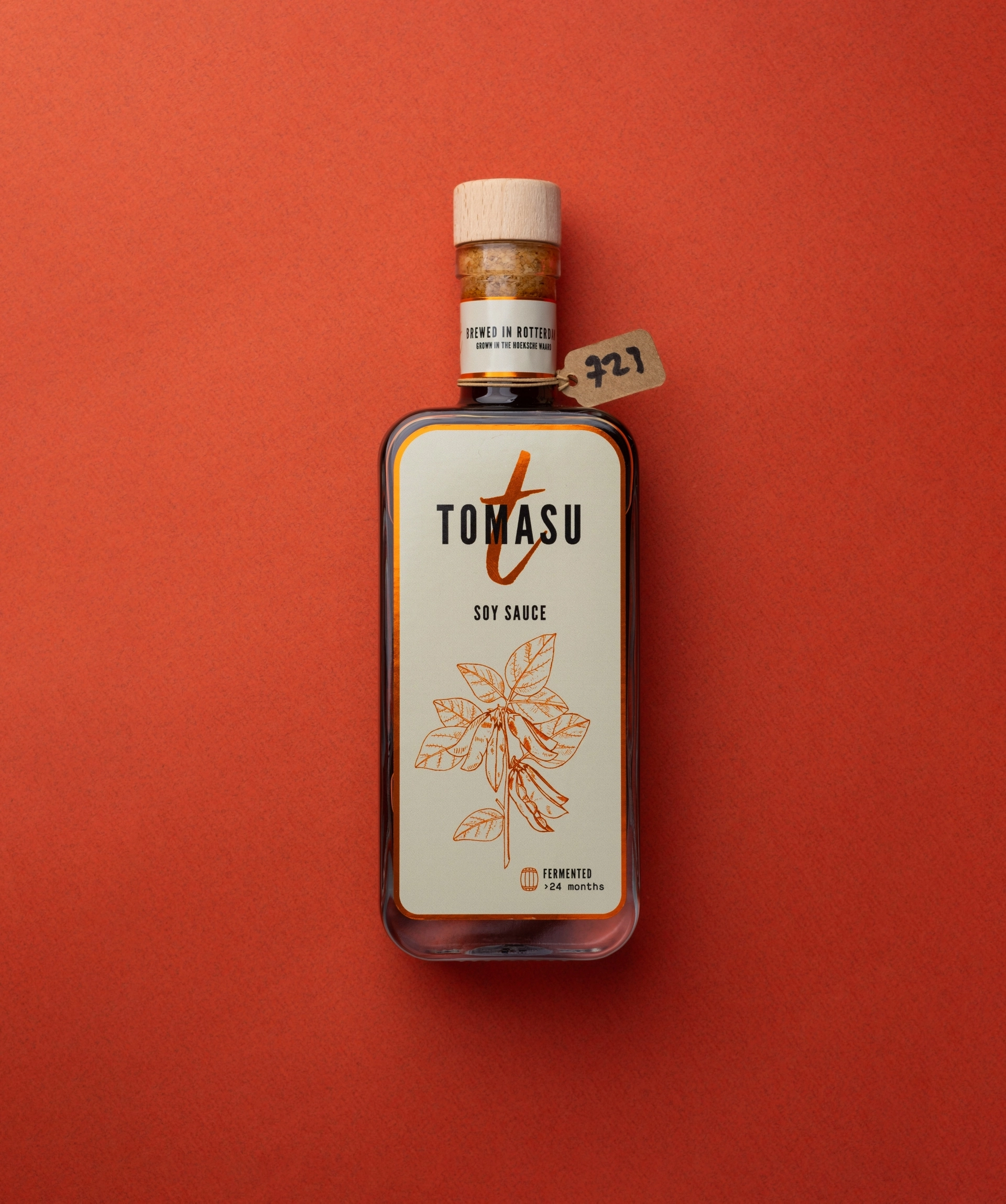 Tomasu teelt zijn eigen sojabonen en tarwe in de Hoeksche Waard. Deze ingrediënten worden gecombineerd met bronwater en natuurlijk grof grijs zeezout, geoogst in Bretagne, Frankrijk. De fermentatie wordt gestart door de toevoeging van Tomasu’s eigen schimmel, Aspergillus Oryzae Tomasu. Het enige ingrediënt dat daarna nog wordt toegevoegd, is tijd.