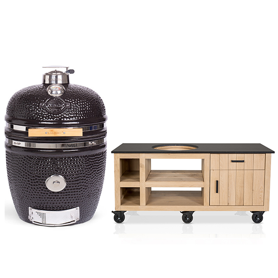 Combinatiedeal voor de Yakiniku Large Kamado Solo Basic + Fraaii Tafel Eikenhout Classic II. Dit prachtige designmeubel is gemaakt van robuust eikenhout en heeft een Dekton werkblad. Het werkblad biedt voldoende ruimte om gerechten voor te bereiden. Daarnaast is er ook opbergruimte in de kast en lade voor barbecue accessoires en kookgerei. De tafel heeft ook twee kleine opbergvakken aan de linkerkant (zoals te zien op de foto). Deze zijn ideaal voor het snel bij de hand hebben van dingen zoals een fles olijfolie of kruiden. De tafel wordt standaard geleverd met zwarte handgrepen en heeft 4 zwenkwielen, waardoor je hem gemakkelijk naar elke gewenste plek kunt verplaatsen.